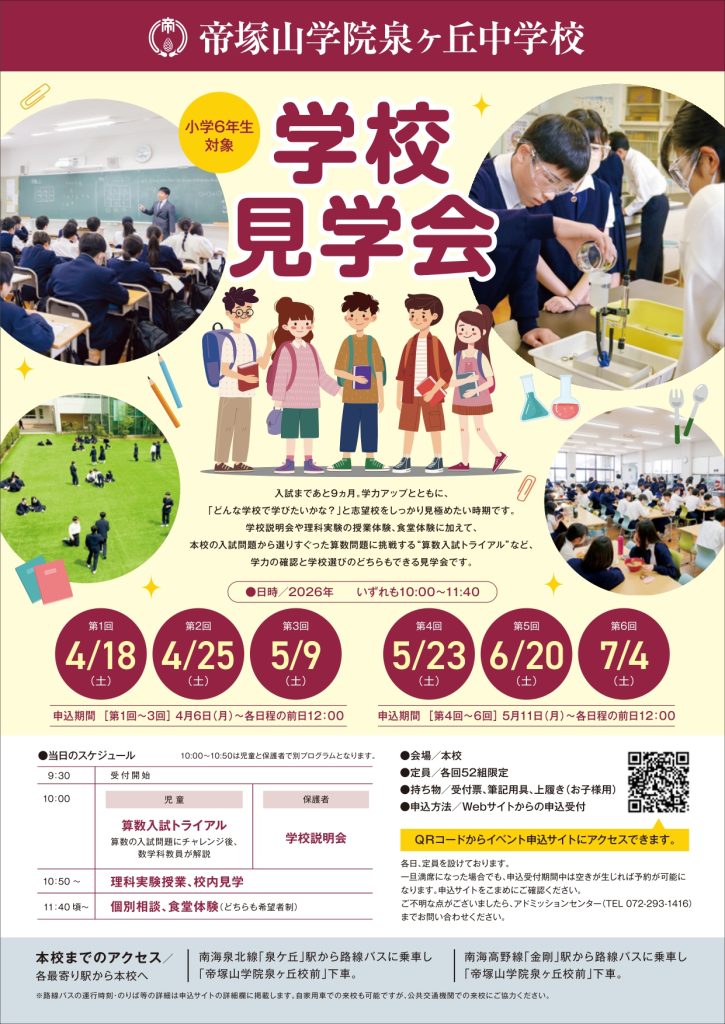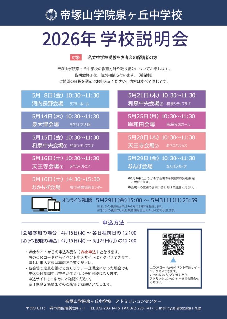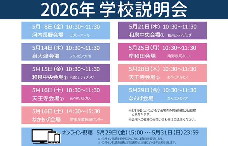 入試イベントや個別学校見学についてのお問い合わせはアドミッションセンター(TEL:072-293-1416)までご連絡ください。