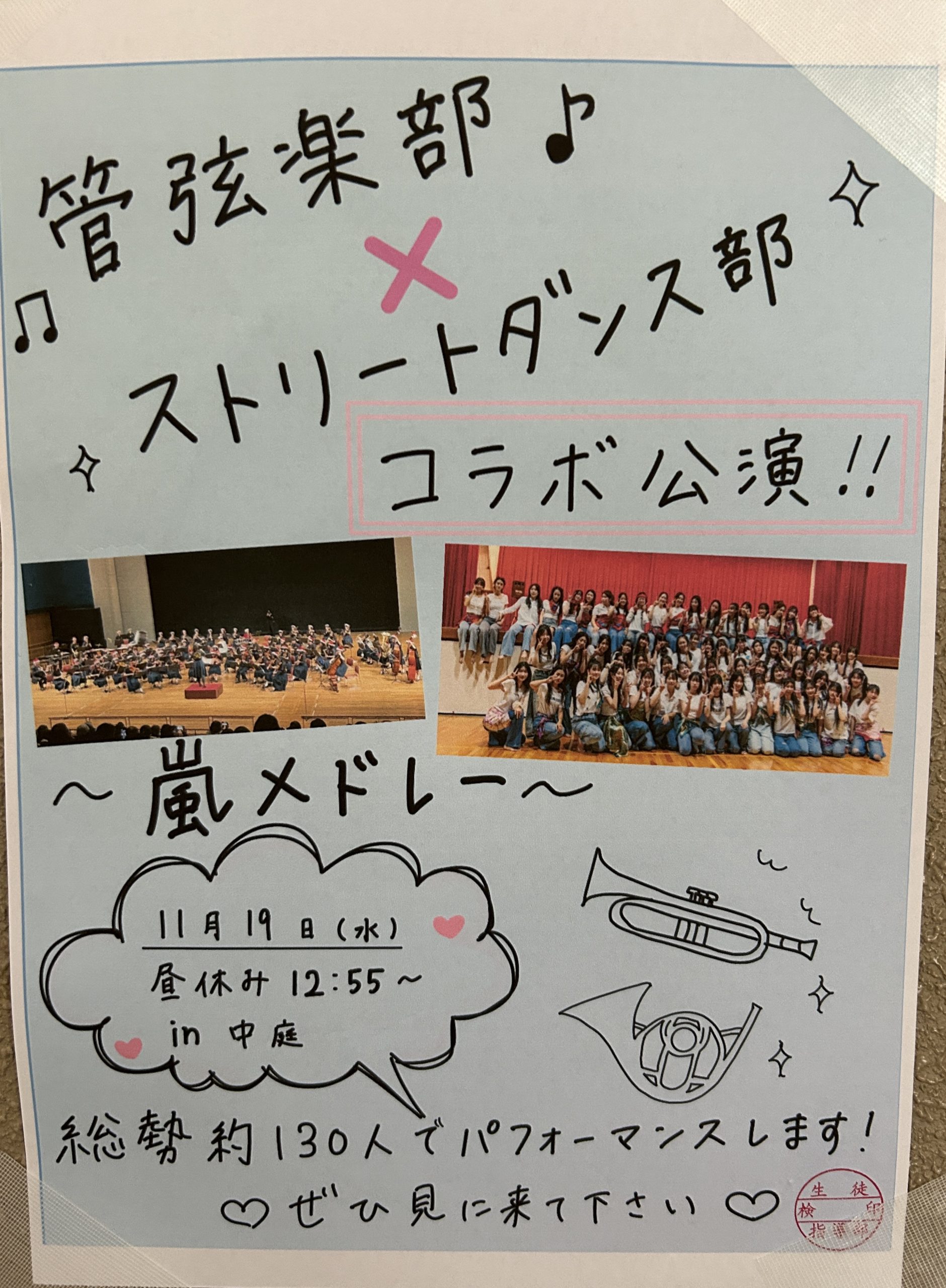 11月19日、管弦楽部とストリートダンス部による初のコラボ公演を行いました。普段は全く異なる場所とスタイルで活動している2つの部活動ですが、今回の公演に向けて全部員が一丸となって1つの公演を作り上げました。それぞれ忙しい時期でしたが、長年の念願であったコラボ公演ができて嬉しく、そして楽しかったです。