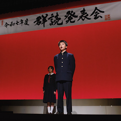 群読とは、詩や古典などの文章を複数人で声を合わせて読む表現活動です。声の大きさや速さ、間の取り方などを工夫しながら、言葉の意味や情景を聴き手に伝えることを目標に練習してきました。