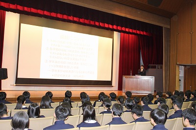 高1生は、学校生活について、教務部からの成績や進級に関わる説明、生徒指導部からは校則の説明など、大切な情報がたくさん伝えられて大変そうな様子でした。困ったことがあったら担任の先生まですぐに相談に来てくださいね!その後、各教室に戻って自己紹介や校舎見学ツアーがあり、頭がいっぱいいっぱいのままオリエンテーションが終了しました。