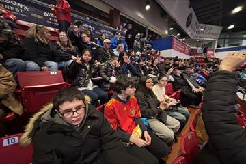 午後7時からは、現地ならではの体験としてアイスホッケー観戦を行いました。スピード感あふれる試合展開に加え、途中には選手同士の激しいぶつかり合いや乱闘も見られ、会場は大いに盛り上がりました。日本ではなかなか味わうことのできない迫力ある雰囲気に、生徒たちも目を輝かせながら試合に見入っていました。