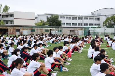 本日は、午前中に高校、午後に中学の体育大会予行が行われました。各種目のルール説明や練習が行われ、どの学年も本番に向けて真剣に取り組んでいました。
