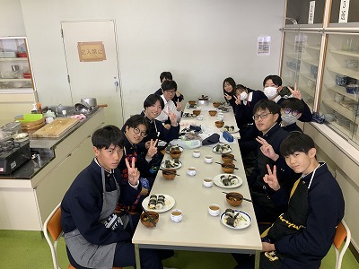 でき上がった料理を囲んで班の仲間と味わいながら、「思ったよりうまくできた」「もっとこうしてみたい」など、自然と会話も広がっていました。今回の実習は、調理の基本だけでなく、協力しながら物事を進める大切さも感じられる時間となったようです。