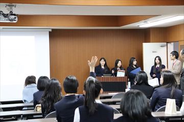 歓迎会セレモニーでは、両校の先生と生徒代表による挨拶のあと、泉ヶ丘生によるプレゼンテーションが行われ、泉ヶ丘校や大阪のおすすめの観光地やスイーツなどを紹介しました。続いて中庭で記念撮影が行われ、和やかな雰囲気の中で交流の始まりを祝いました。