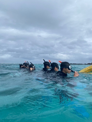 小浜島班はシュノーケリングです。幸い波も穏やかで海の色も澄んでいました。ほとんどの生徒が初めての経験ということでしたが、彼らの表情からは怖さや不安はあまり感じず、わくわくしているようでした。浅瀬でぷかぷか浮くところから練習。徐々に慣らしていって、いざ潜ると、美しい青の空間に色鮮やかな珊瑚や魚がすぐ目の前です。その美しさに感動したのか興奮したのか、みんな思わず声を上げます。沖合いに出る頃には海にも慣れ、彼ら彼女らはすっかり「海人」になっていました。
