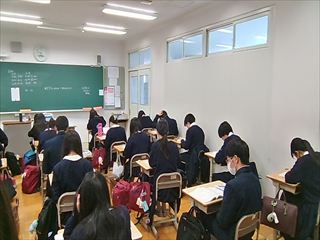 教室には、本番さながらのほどよい緊張感が漂い、一人ひとりがこれまで培ってきた知識と経験を確認するように、真剣な表情で問題と向き合っていました。休み時間には友人と問題を確認し合う姿、教員に質問する姿も見られ、最後まで成長しようとする意欲が伝わってきます。