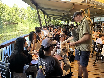 園内の池に棲むワニのそばで朝食を楽しんでいると、飼育員に抱かれたコアラが登場。生徒たちは到着早々、オーストラリアらしい動物たちとの出会いに笑顔があふれていました。ワニの餌やり見学や放し飼いのカンガルー、ワラビーとのふれあいを通して、オーストラリアの自然の豊かさを肌で感じました。