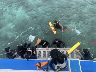 太陽の光に照らされたエメラルドグリーンの海と、海中のサンゴや魚たちの美しさに、生徒たちは歓声を上げていました。